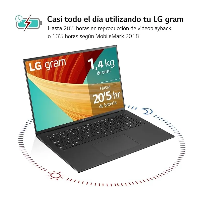El Ordenador Portátil LG Gram 17Z90R 17Z90R-E.AD75B también destaca por su gran autonomía, gracias a su batería de 90 Wh que permite hasta 13,5 horas de uso continuo. Dispone de 32 GB de memoria LPDDR5 a 6000 MHz, lo que asegura una respuesta rápida y eficaz en cualquier tarea. El almacenamiento de 512 GB SSD NVMe proporciona velocidad y espacio suficiente para guardar archivos pesados sin preocuparse por el rendimiento. Además, cuenta con conectividad de última generación, incluyendo Wi-Fi 6, Bluetooth 5.1 y puertos USB 3.2 y USB4, así como salida HDMI y DisplayPort. El sistema de sonido Dolby Atmos, la cámara con infrarrojos y el teclado retroiluminado con diseño en español completan un equipo versátil y preparado para cualquier entorno profesional o personal.