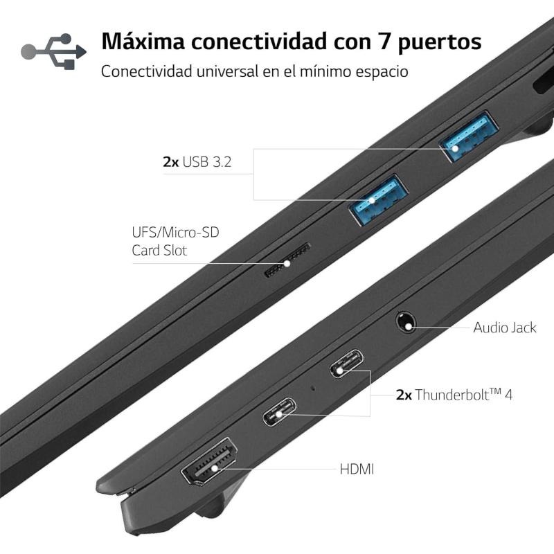 MÚLTIPLES PUERTOS DE CONEXIÓN: LG gram ofrece no solo varios puertos sino también dos Thunderbolt™ 4 para la máxima escalabilidad. Experimenta la pantalla 5K con 40GB de velocidad de transferencia mientras cargas dispositivos externos simultáneamente.