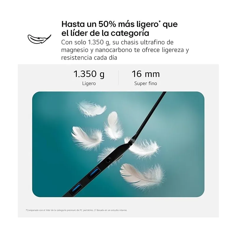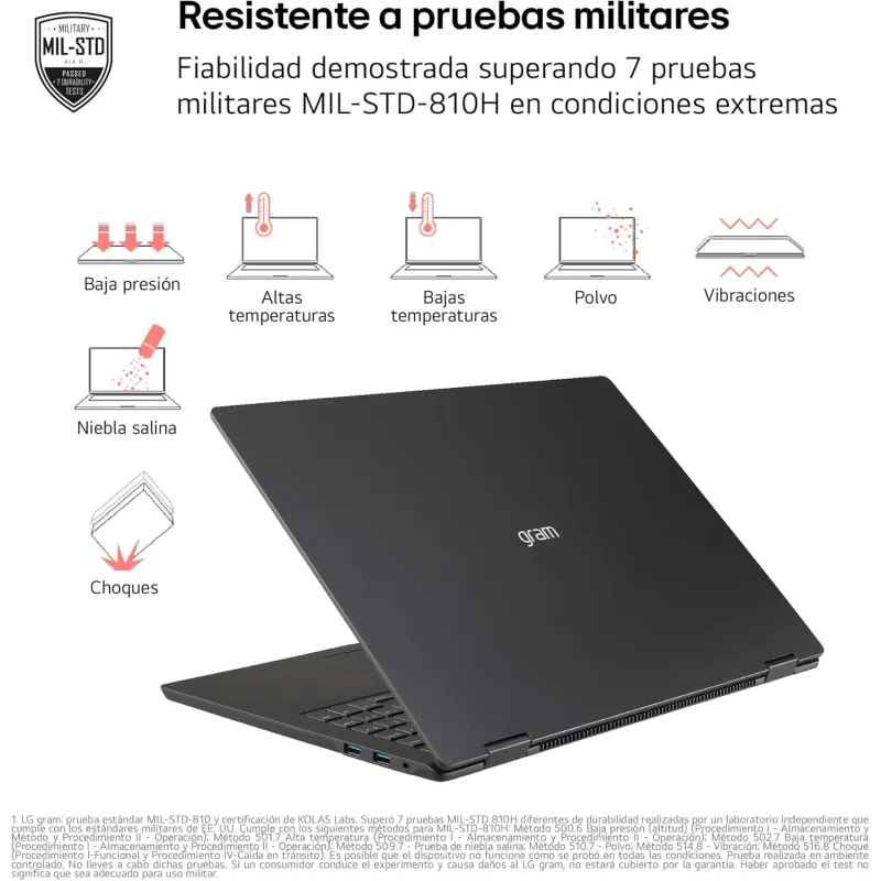 LIGEREZA: Con solo 1,350 Kg de peso combinado con un grosor de 16 mm, LG gram se adapta libremente a cualquier estilo de vida. Diseñado para superar rigurosas pruebas militares, este diseño demuestra que la durabilidad y la elegancia pueden ir de la mano.