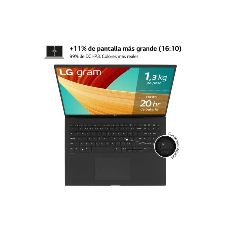 PANTALLA QUE TE CAUTIVA: El portátil de LG te ofrece una pantalla de 43,2 cm (17") con tratamiento antirreflejos y panel IPS WQXGA (2560 x 1600 px), que cubre el 99% del espacio de color DCI-P3. Esto significa que podrás disfrutar de unos colores ricos y vívidos, con un alto nivel de detalle y contraste. Además, su formato 16:10 te permite ver más contenido con menos desplazamientos, lo que optimiza tu productividad y tu entretenimiento.