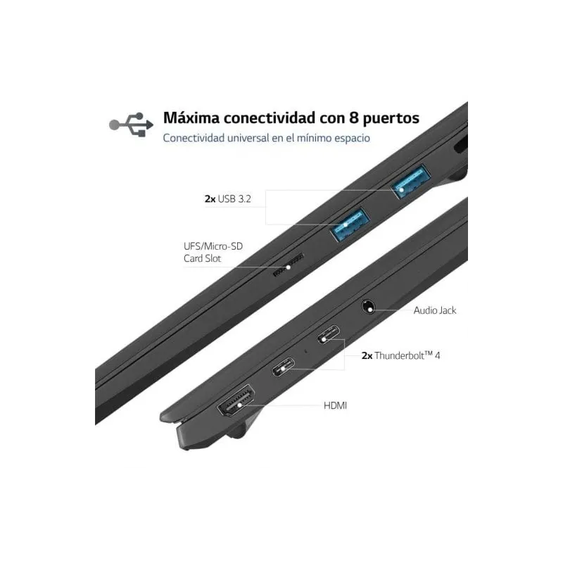 MÚLTIPLES PUERTOS DE CONEXIÓN: LG gram ofrece no solo varios puertos sino también dos Thunderbolt™ 4 para la máxima escalabilidad. Experimenta la pantalla 5K con 40GB de velocidad de transferencia mientras cargas dispositivos externos simultáneamente.