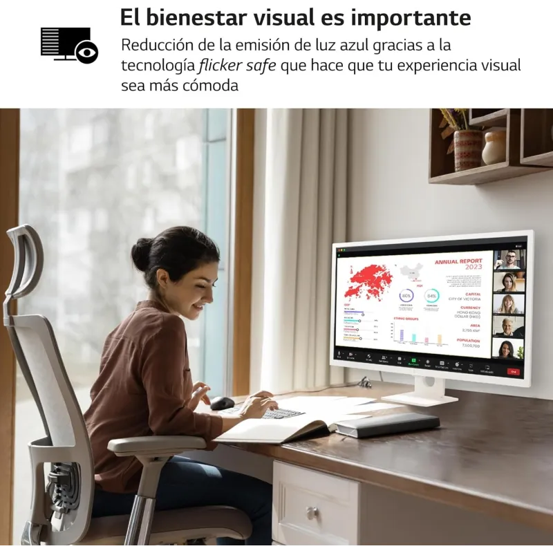 La tecnología HDR10 eleva el rango dinámico, permitiendo que los blancos sean más brillantes y los negros más profundos, creando una experiencia visual más inmersiva. Además, su diseño sin marco y color blanco puro añade un toque de sofisticación a cualquier espacio de trabajo.