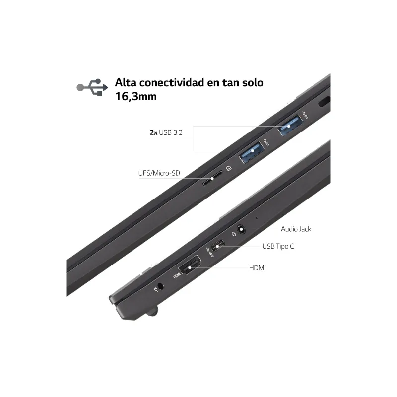 DISEÑO ELEGANTE Y LIGERO: ¿Te gustaría tener un ordenador portátil que sea fácil de transportar y que tenga un aspecto sofisticado? Con el nuevo portátil de LG, tendrás un diseño elegante y ligero que se adapta a tu estilo. Su chasis de aluminio es resistente y pesa solo 1,6 kg, lo que lo hace cómodo de llevar a cualquier parte. Además, cuenta con hasta 6 puertos de conexión para que puedas conectar todos tus dispositivos sin problemas. Entre ellos se incluyen 2 USB 3.2, 1 USB Tipo C, 1 HDMI, una entrada de auriculares y una ranura para tarjetas UFS/Micro-SD 3.0.