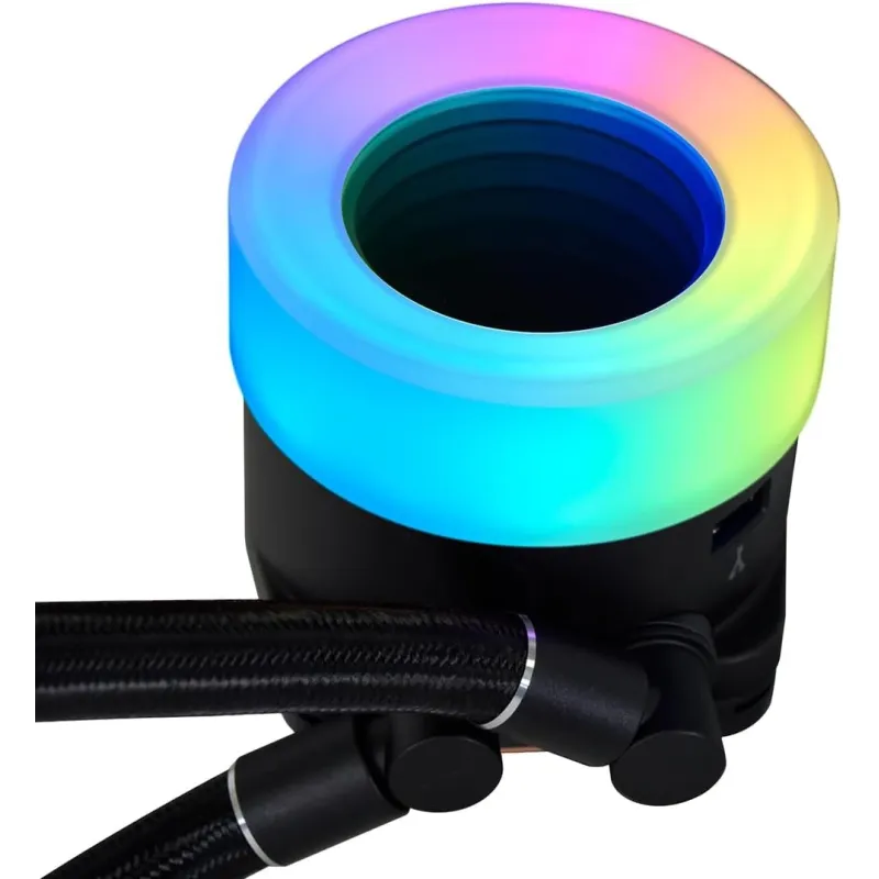 ELIJA LOOK PREFERIBLE: La tapa de bomba de la serie Galahad II Trinity tiene tres diseños intercambiables, cada uno con una apariencia única y dos anillos de colores que se pueden controlar individualmente con diferentes efectos de iluminación.