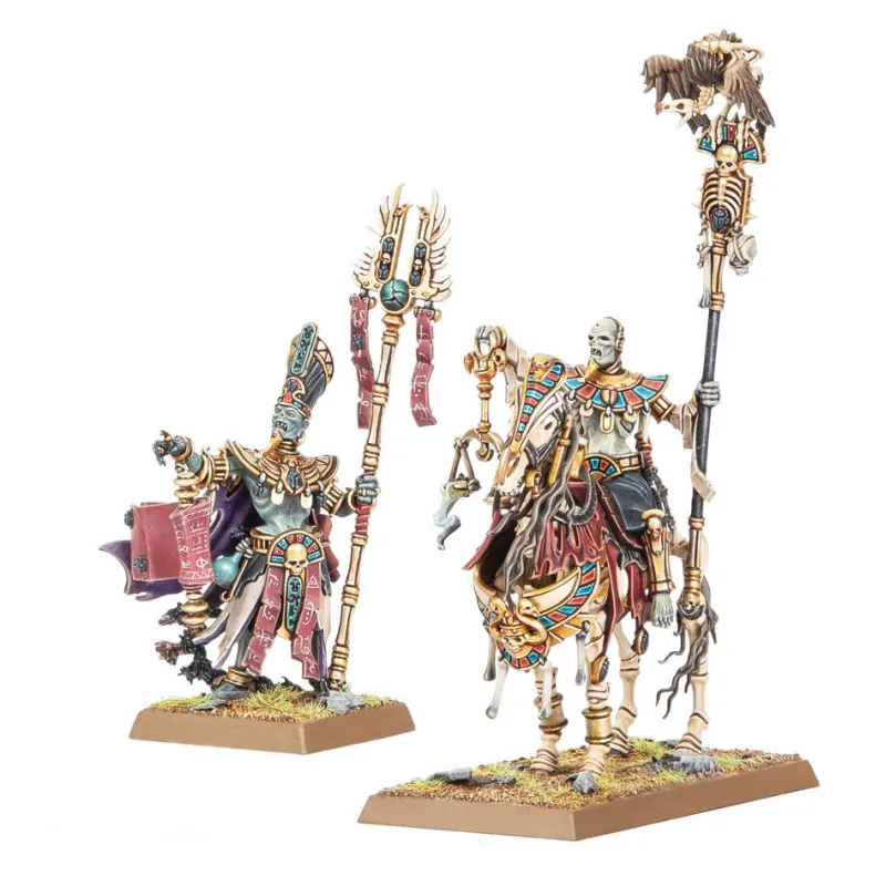 El núcleo del kit son héroes magos especializados en apoyo: lanzan conjuros, otorgan bonificadores a unidades cercanas y permiten acceder a hechizos propios de los Reyes Funerarios. Sobre la mesa, esto se traduce en más opciones tácticas para controlar el centro del tablero, debilitar a unidades enemigas clave o reforzar bloques de infantería que de otro modo serían más vulnerables al desgaste.