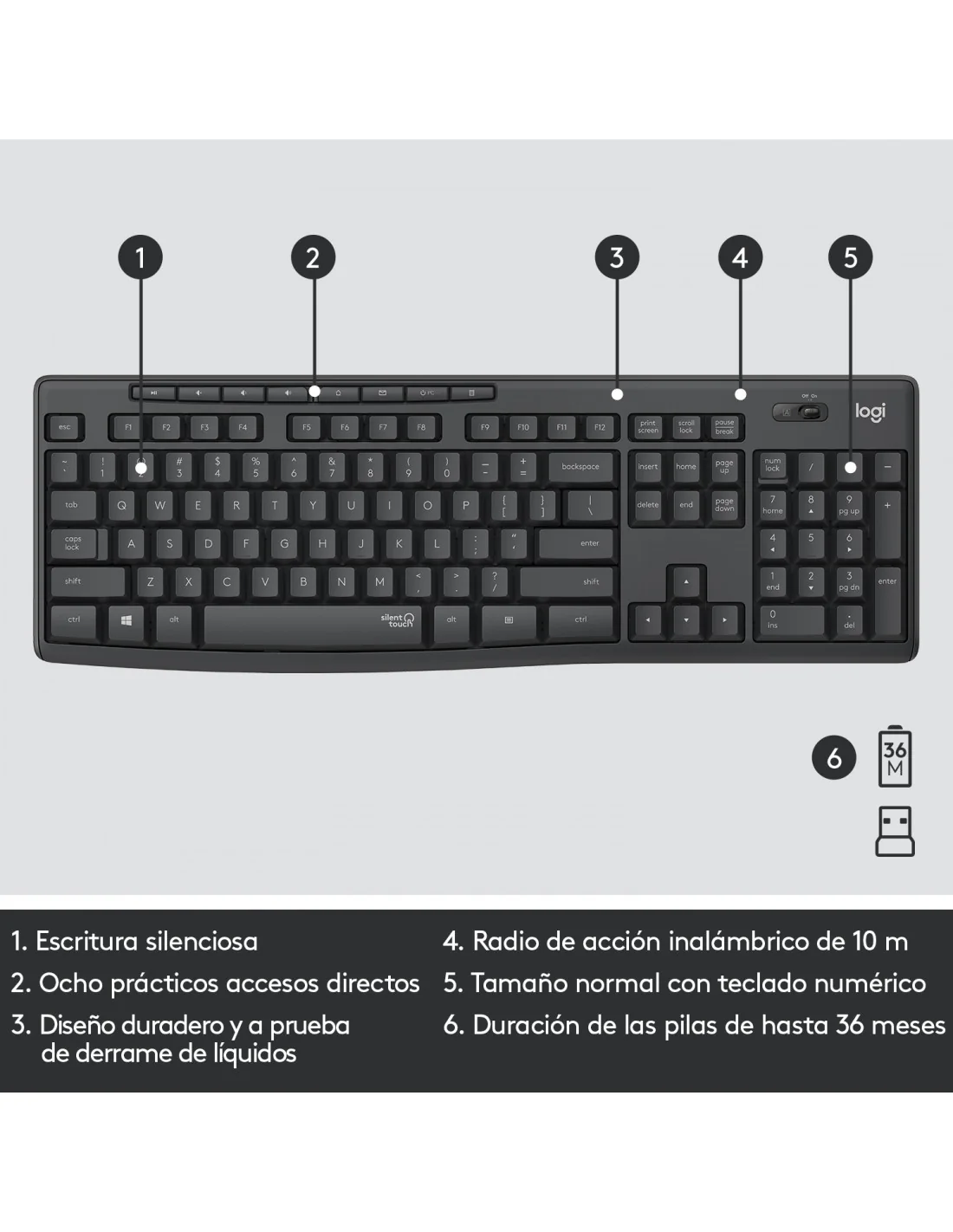 Menos ruido, más concentración: Mantén la concentración en tu trabajo, sin distracciones. La combinación inalámbrica silenciosa Logitech MK295 incluye SilentTouch, una tecnología exclusiva de Logitech que elimina más del 90% del ruido producido por teclados y ratones. Ofrece la misma sensación de clic y escritura que la mejor combinación de todas y sin molestos ruidos al hacer clic o escribir.