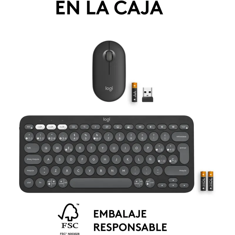 - Contenido del paquete: Teclado Pebble Keys 2 K380s 2 pilas AAA (preinstaladas) Pebble Mouse 2 M350s 1 pila alcalina AA (preinstalada) Documentación del usuario Tarjeta de garantía para CN y JP Receptor Logi Bolt Documento de información importante (IID)