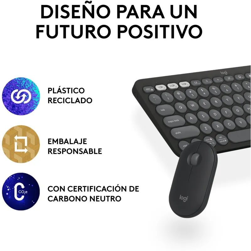 DESAFÍA LO ABURRIDO: Con la emblemática Pebble 2 Combo, compuesta de un teclado y un ratón estilizados fabricados con plástico reciclado. Alterna fácilmente entre 3 dispositivos con sólo pulsar un botón.