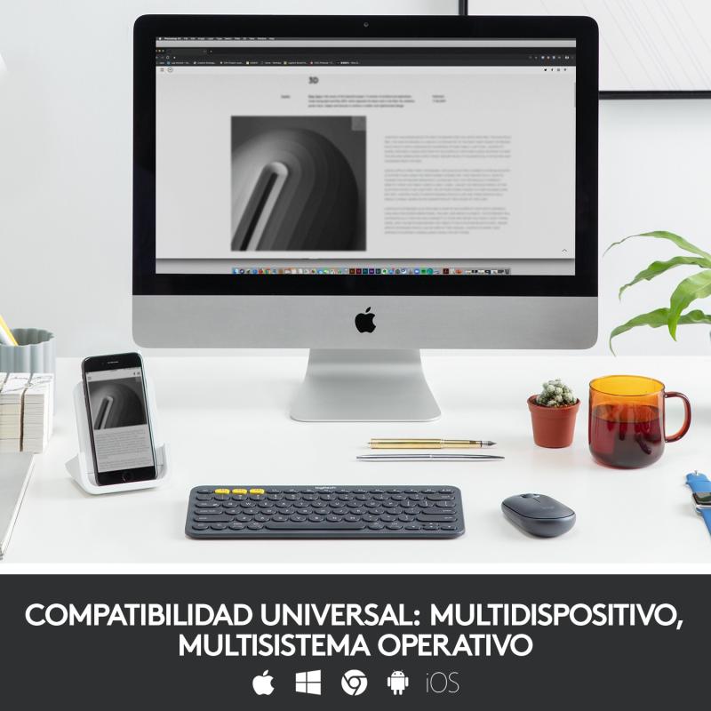 ESCRIBE CON CUALQUIER DISPOSITIVO: Cualquier dispositivo, cualquier sistema operativo. El teclado multidispositivo K380 se conecta a todos los dispositivos inalámbricos Bluetooth compatibles con teclados externos, para permitir trabajar óptimamente con Windows®, macOS, iPadOS, Chrome OS™, Android™, iOS e incluso Apple TV. Asigna automáticamente las teclas, recuerda los accesos directos y ofrece un diseño familiar para tu plataforma preferida.
