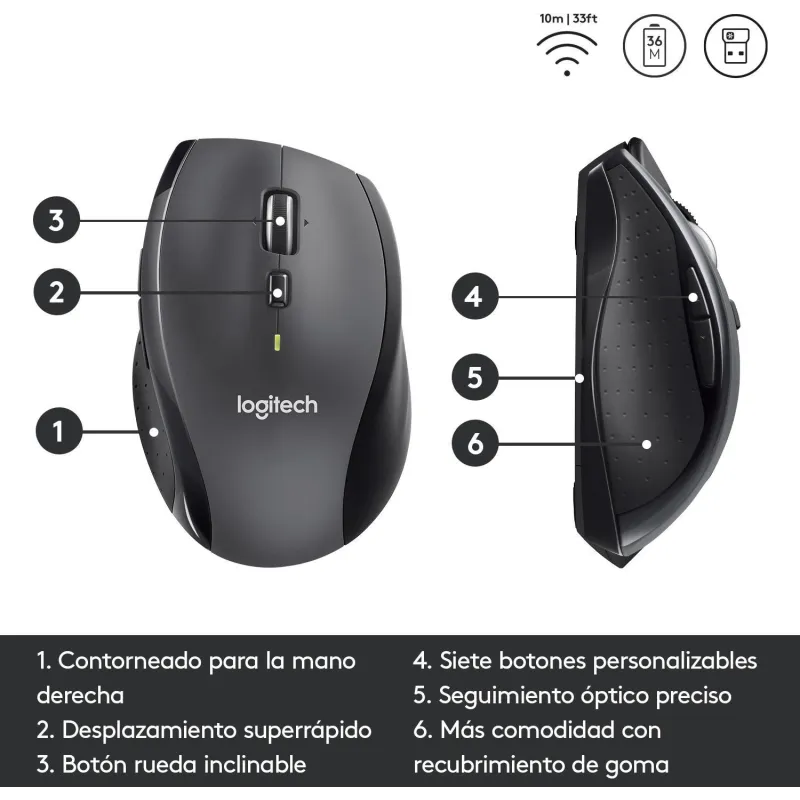 LIBERTAD INALÁMBRICA: La conexión sólida y fiable te ofrece libertad sin cables en un radio de hasta 10 metros gracias al estable receptor USB Unifying™. Conecta hasta seis dispositivos compatibles a este receptor sin preocuparte de retrasos ni interrupciones. El M705 es compatible con macOS y Windows®. Además, cuenta con la certificación Works With Chromebook™, por lo que tu productividad está garantizada.