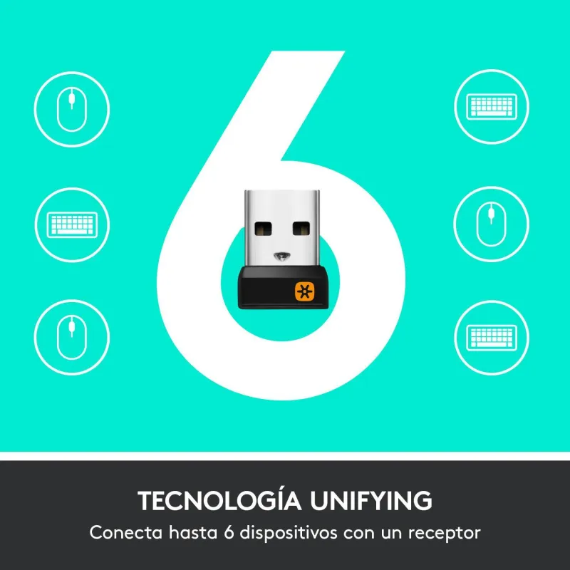 RECEPTOR LOGITECH ® UNIFYING: El minúsculo receptor inalámbrico permanece en el notebook, no hace falta desconectarlo para desplazarse. Además, puede agregar fácilmente un teclado o un ratón compatible. Más información sobre el receptor Unifying.