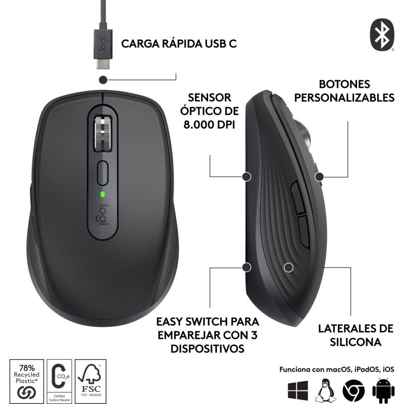 Ratón Logitech MX Anywhere 3S Inalámbrico con Conectividad Bluetooth, DPI de 8000, con 6 Botones, Color Negro
