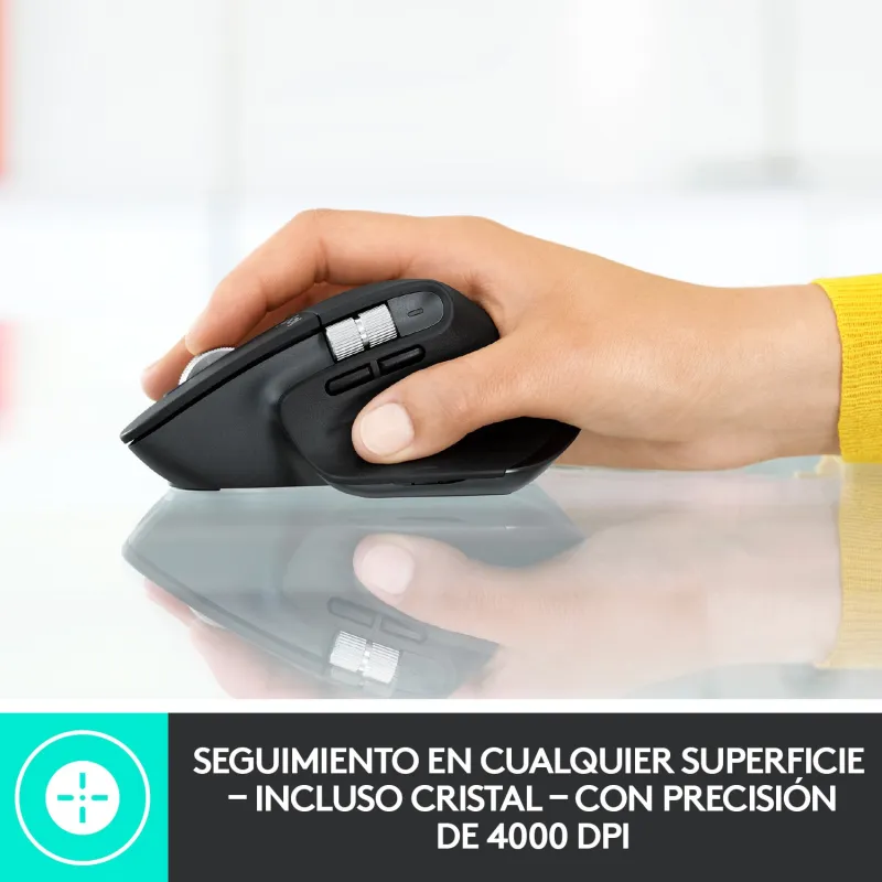 SEGUIMIENTO DE 8000 DPI EN CUALQUIER SUPERFICIE: MX Master 3S está equipado con nuestro sensor más preciso hasta la fecha, con precisión y capacidad de respuesta de próxima generación. El sensor óptico de 8.000 dpi hace seguimiento casi en cualquier superficie, incluso sobre cristal. Puedes ajustar la sensibilidad de seguimiento en Logi Options+ y establecer el nivel adecuado según tu flujo de trabajo y la resolución del monitor.