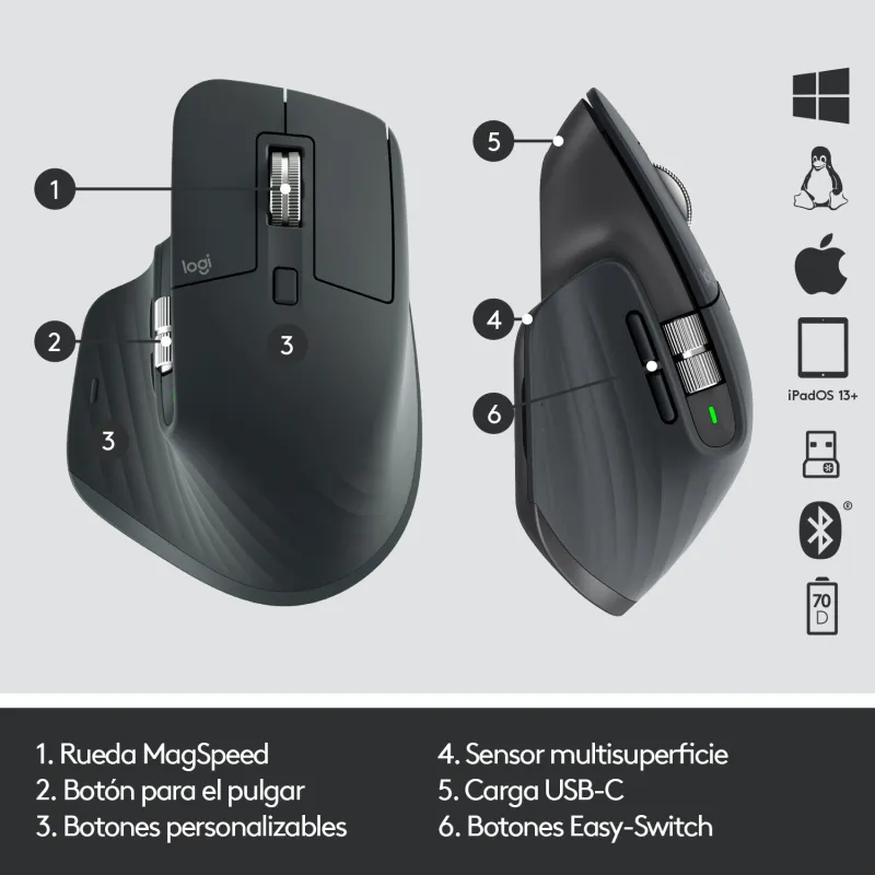CONEXIÓN INALÁMBRICA, LIBERTAD SIN LÍMITES: Se conecta de forma inalámbrica a tu ordenador o a otros dispositivos mediante un receptor USB o Bluetooth®. Puedes usarlo con Windows, macOS o Linux, sin necesidad de instalar ningún software adicional. Además, puedes emparejarlo con hasta tres dispositivos y cambiar entre ellos con solo pulsar un botón. Así, podrás trabajar con más fluidez y eficiencia.