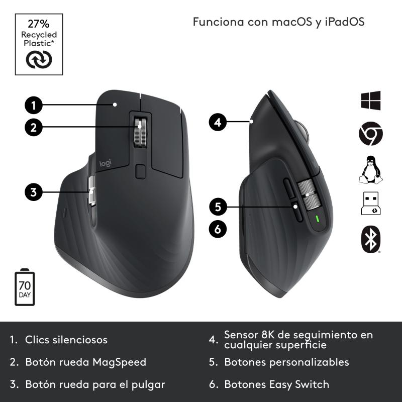 CARGA RÁPIDA, CONEXIÓN AL INSTANTE: Hasta 70 días con una carga completa, y permite tres horas de uso con un minuto de carga rápida. Cable de carga USB-C incluido para recargar la energía. Compatible inmediatamente con los principales sistemas operativos, como Windows, macOS, Chrome OS o Linux. Emparejamiento al instante con hasta tres dispositivos a través de Bluetooth de bajo consumo o con el receptor USB Logi Bolt incluido.