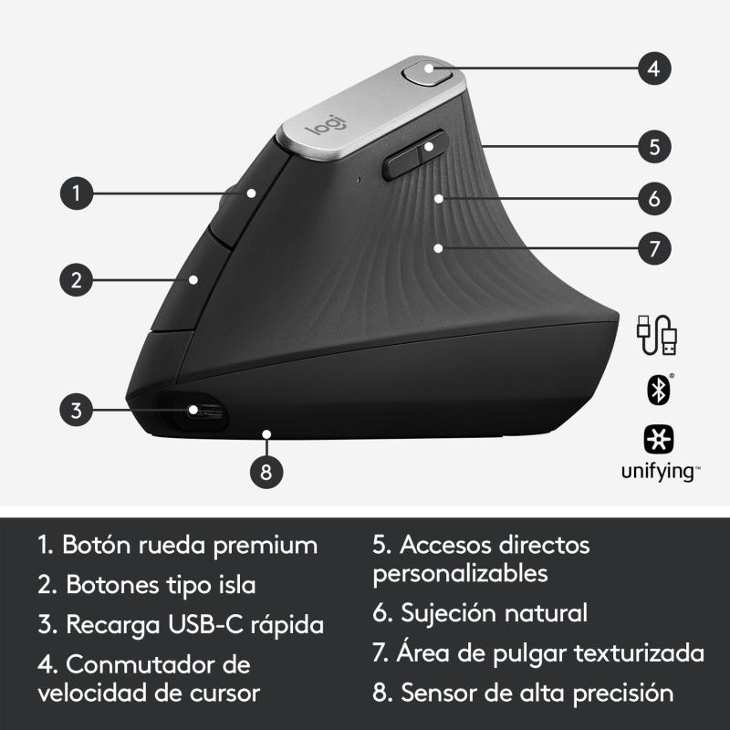 FORMA CÓMODA Y SUPERFICIE TEXTURIZADA: MX Vertical tiene una forma pensada para la mano humana y es suave al tacto. Su exclusiva forma con superficie de goma texturizada garantiza una sujeción firme y cómoda.