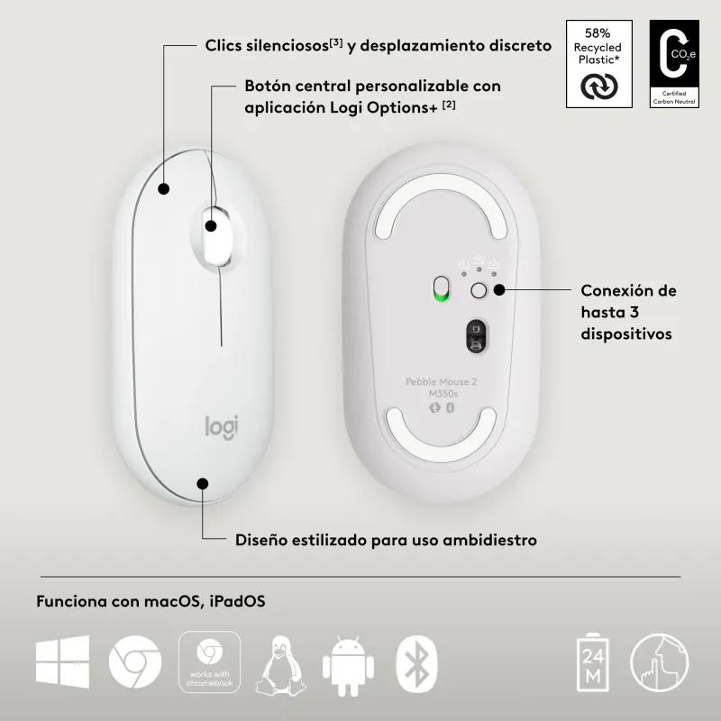 Logitech Pebble Mouse 2 M350s Blanco compacto y silencioso