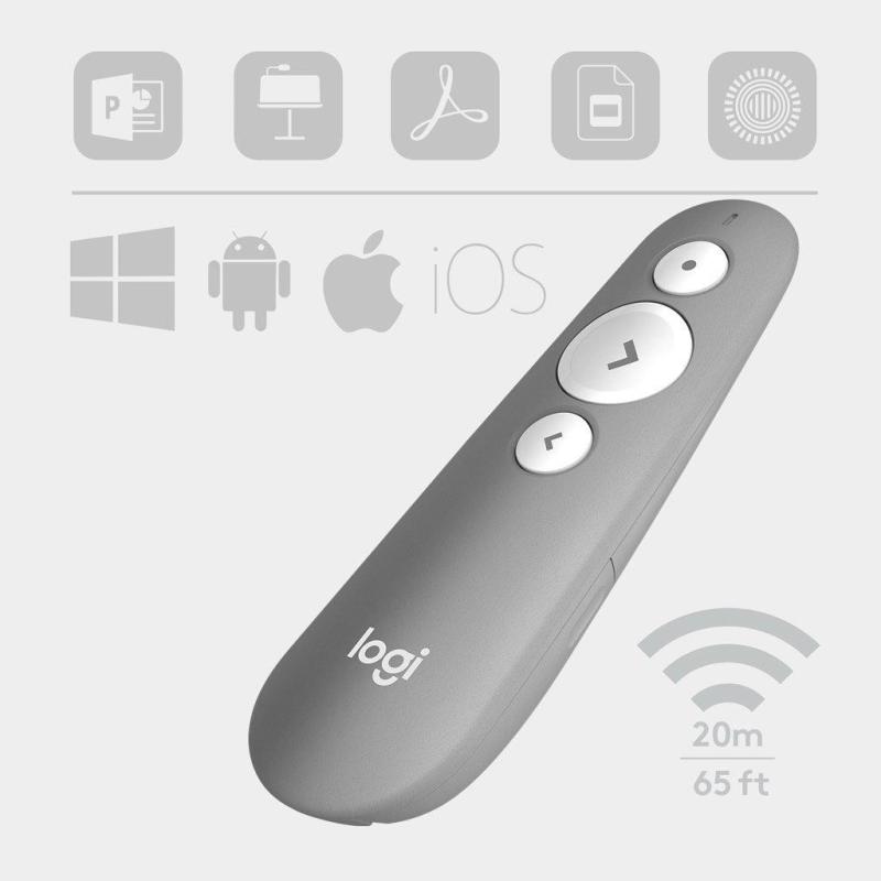 Apuntador inalámbrico Logitech R500 con puntero láser rojo conectividad Bluetooth/RF y alcance de 20 m, color Gris