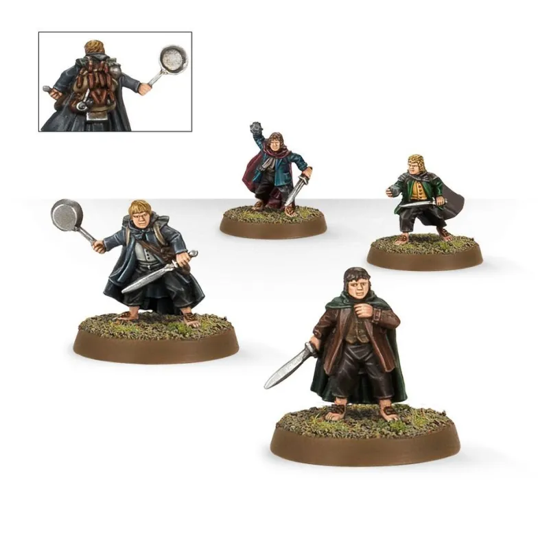 Es un set de miniaturas de la Comunidad del Anillo en plástico multicomponente, listo para montar, pintar y usar en juegos de la Tierra Media.