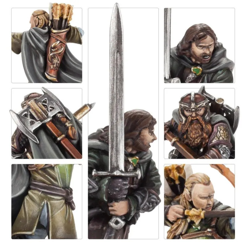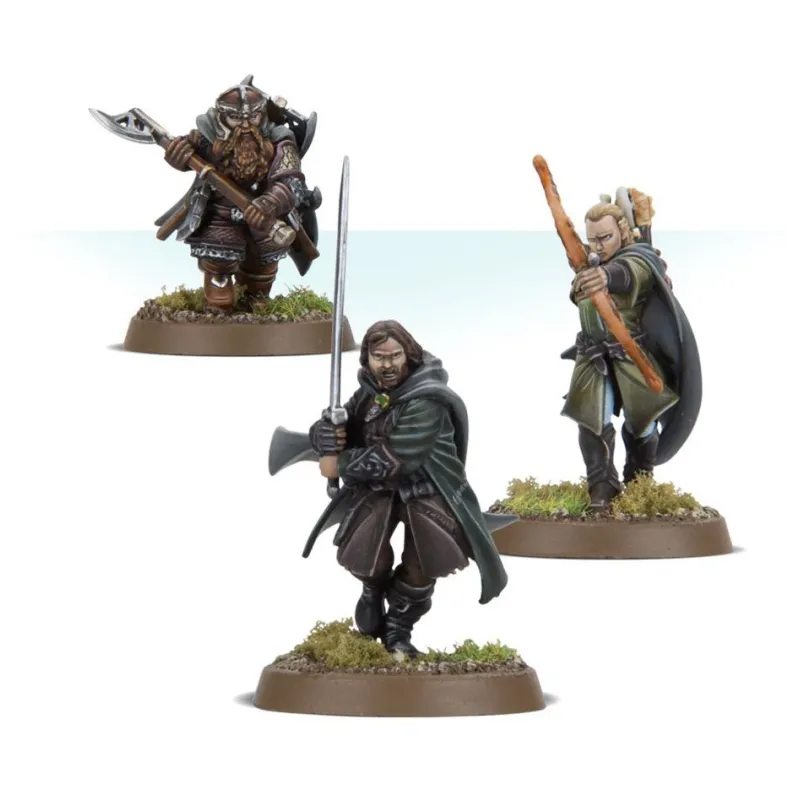 Reunir en un solo set a Aragorn, Legolas y Gimli simplifica montar listas temáticas donde la compañía actúa unida, permite aprovechar sus reglas de sinergia en muchos escenarios oficiales y da más coherencia visual a la mesa cuando despliegas fuerzas de la Luz centradas en la Comunidad.