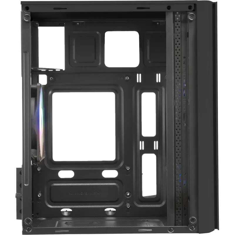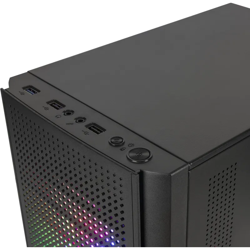 Este gabinete de PC en formato Mini Tower ofrece un diseño compacto y elegante en color negro, ideal para cualquier setup. Es compatible con tarjetas madre micro ATX y Mini-ITX, y cuenta con 2 puertos de 3.5" y 4 bahías de 2.5" para almacenamiento, así como 4 ranuras de expansión para mayor flexibilidad. La iluminación integrada, disponible en colores azul, verde y rojo, añade un toque de estilo personalizable.
