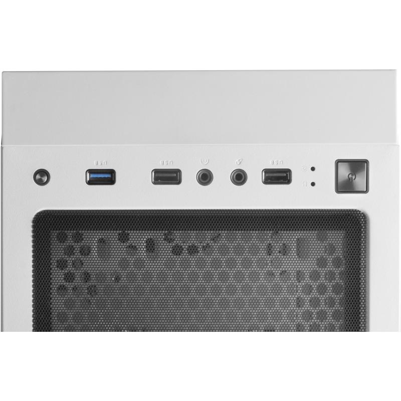 En el panel de conexiones incluye 2 puertos USB 2.0, 1 puerto USB 3.2 Gen 1 y conexiones de audio para mayor comodidad. Este modelo no incluye fuente de alimentación, brindando libertad para seleccionar la opción ideal según las necesidades de cada usuario. Con dimensiones de 214 mm de ancho, 390 mm de profundidad y 455 mm de altura y un peso de 5,93 kg, este chasis es una opción completa y estética para cualquier setup gaming.