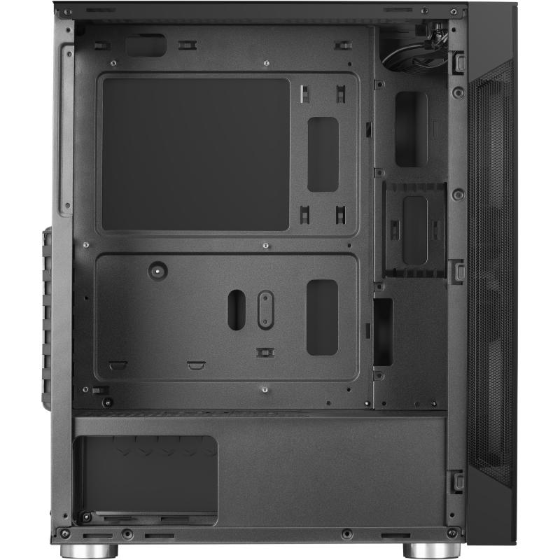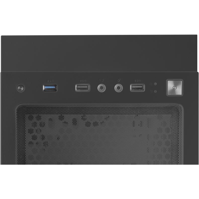 En el panel de conexiones incluye 2 puertos USB 2.0, 1 puerto USB 3.2 Gen 1 y conexiones de audio para mayor comodidad. Este modelo no incluye fuente de alimentación, brindando libertad para seleccionar la opción ideal según las necesidades de cada usuario. Con dimensiones de 214 mm de ancho, 390 mm de profundidad y 455 mm de altura y un peso de 5,93 kg, este chasis es una opción completa y estética para cualquier setup gaming.