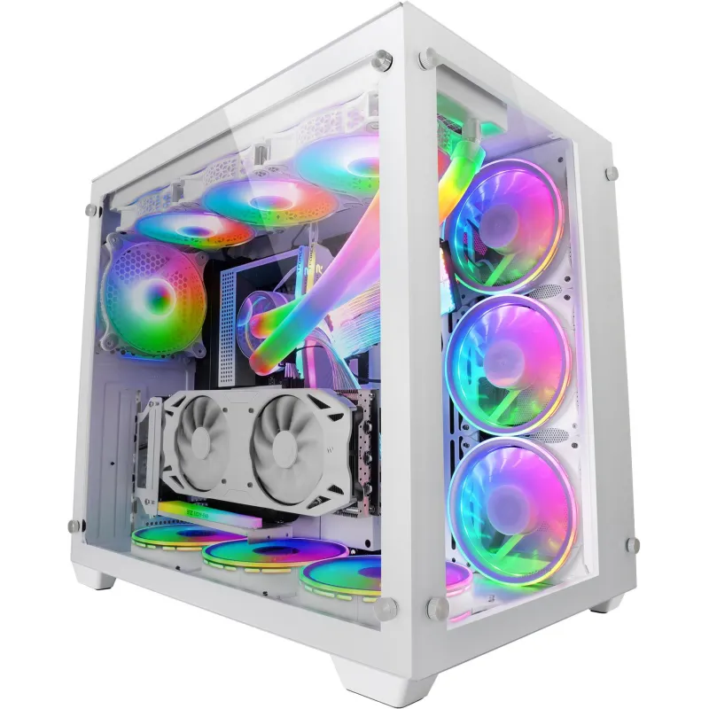 La torre de PC en color blanco combina un diseño elegante con una ventana lateral de vidrio templado, ideal para los entusiastas del juego que buscan mostrar su hardware interno. Su compatibilidad con múltiples formatos de tarjetas madre como ATX, micro ATX, Mini-ITX y EATX proporciona una flexibilidad excepcional para diversas configuraciones. Con siete ranuras de expansión y capacidad para tarjetas gráficas de hasta 41,8 cm, es perfecta para configuraciones de alto rendimiento.