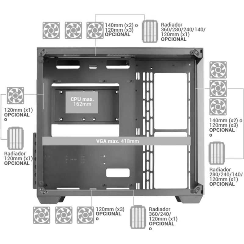 - Diámetro de ventiladores inferiores secundarios soportados: 120 mm