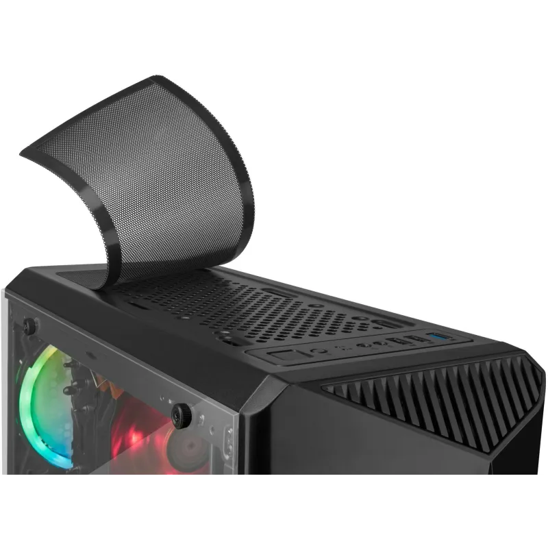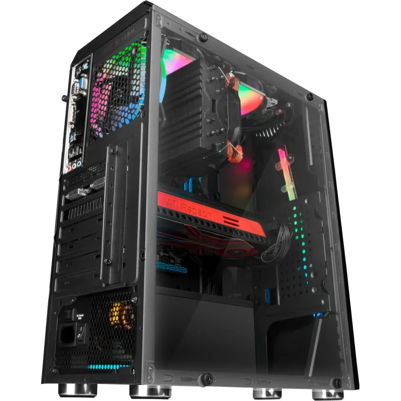 Este chasis de acero presenta un diseño de torre en negro, ideal para sistemas de juego. Soporta placas madre ATX, micro ATX y Mini-ATX, brindando flexibilidad en la construcción. Dispone de dos bahías de 3.5" y dos bahías de 2.5" para almacenamiento interno, además de siete ranuras de expansión. Su ventana lateral de vidrio templado y la iluminación en colores azul, verde y rojo en el frontal lo convierten en una elección destacada para gamers que buscan estética y rendimiento.