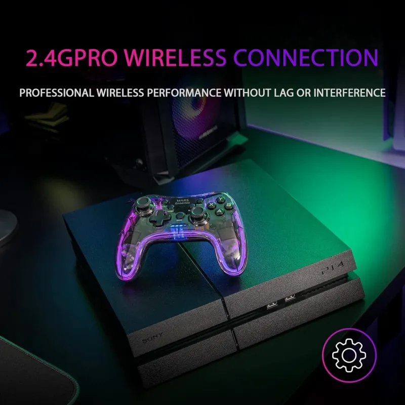 GAMEPAD INALÁMBRICO MGP-24: Gamepad con conexión inalámbrica profesional 2.4GPRO, sin lag y con la máxima estabilidad de conexión. Espectacular diseño translúcido negro con iluminación NEÓN RGB. Sistema de vibración háptica dual y compatibilidad superior multiplataforma.