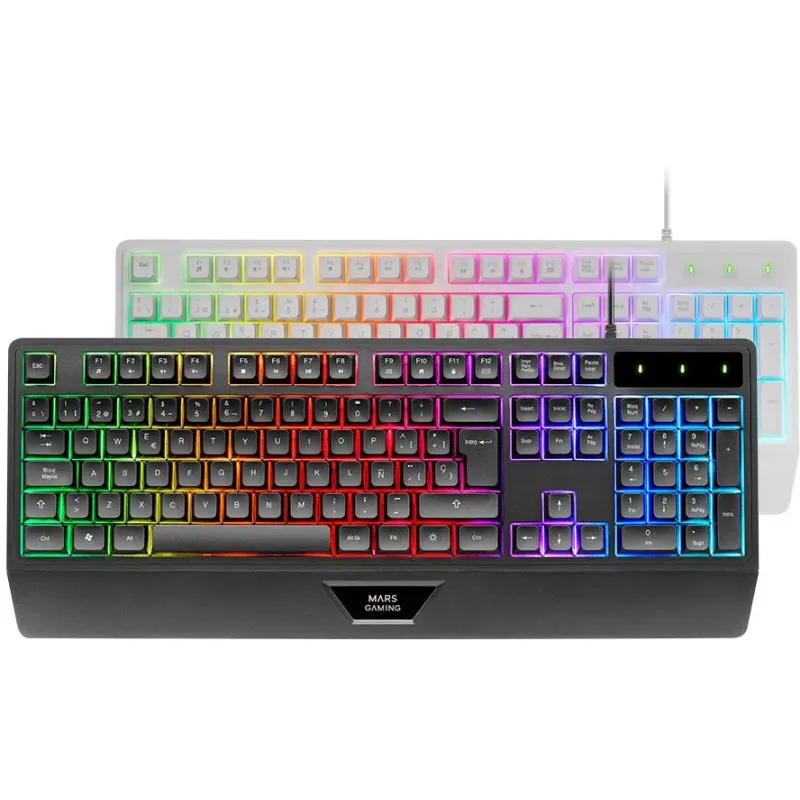 El Teclado Mars Gaming MK124ES está diseñado para ofrecer una experiencia de juego cómoda y precisa. Con un formato completo (100%), este teclado incluye teclado numérico y teclas multimedia, lo que permite un control total sin necesidad de recurrir al ratón. Su interruptor de membrana proporciona una pulsación suave y silenciosa, ideal para largas sesiones de uso. Además, cuenta con compatibilidad multidispositivo y soporta sistemas operativos Windows, Mac y Linux, lo que lo convierte en una opción versátil para cualquier usuario. Su perfil alto y diseño ergonómico con reposamuñecas integrado favorecen una postura natural de las manos, reduciendo la fatiga durante el uso intensivo.