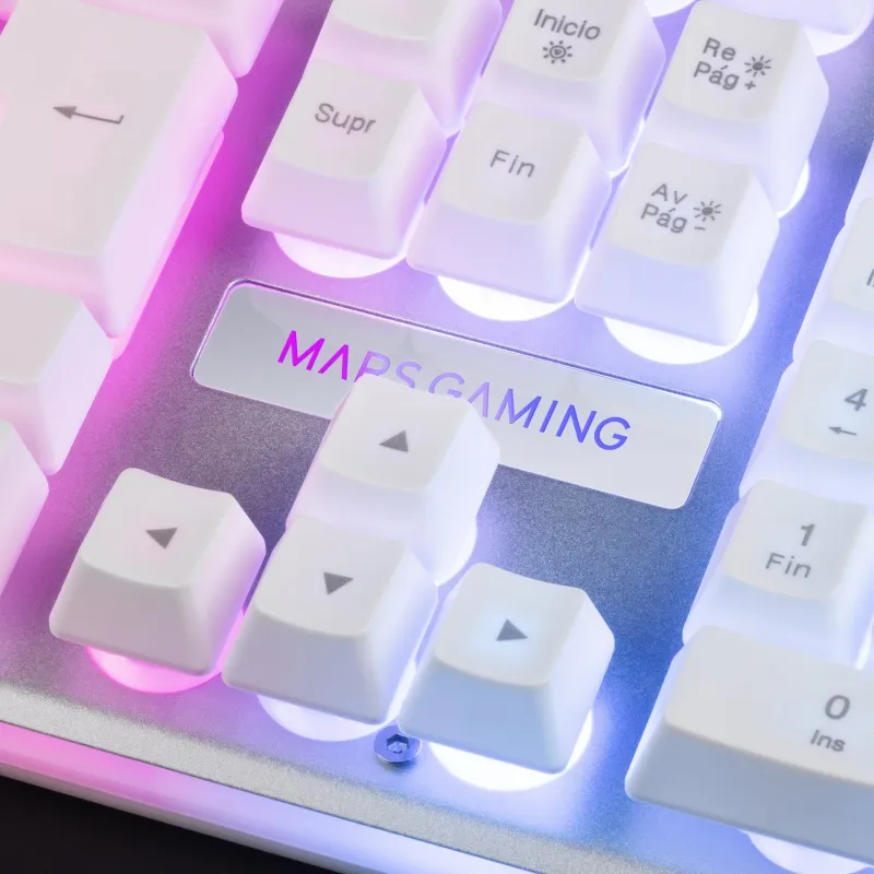 ILUMINACIÓN FRGB RAINBOW CON EFECTO HALO: El MK220 cuenta con una espectacular iluminación FRGB rainbow y una franja ambiental periférica que potencia aún más la estética del teclado, proyectando la luz sobre el escritorio y mostrando un halo que completa tu setup de forma dinámica.