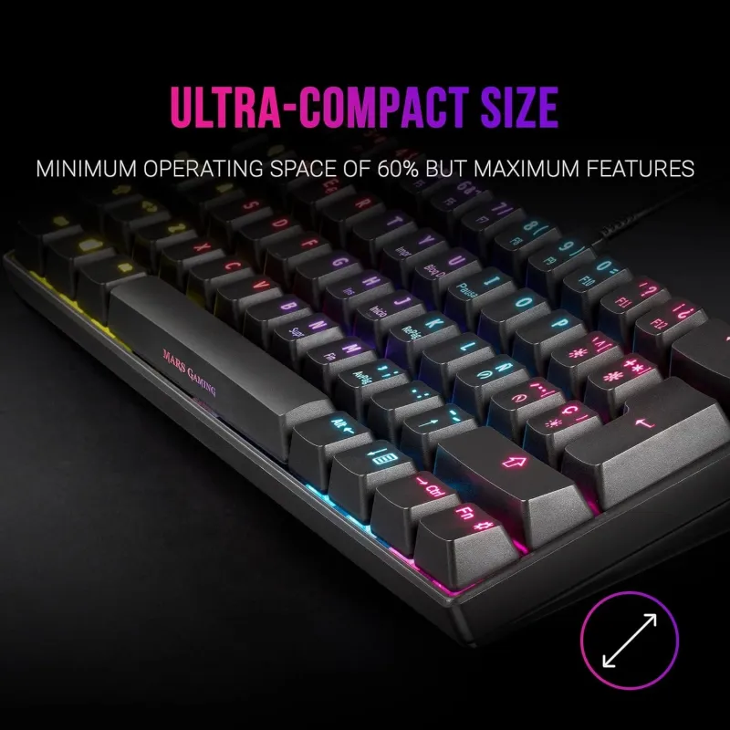 TECLADO GAMING MKMINI: El teclado ultra-compacto tamaño 60% FULL RGB CHROMA que estabas esperando. Con los mejores switches mecánicos OUTEMU PRO, conector USB-C a USB-A extraíble, 14 efectos de iluminación por hardware y un completo software de configuración. Todo ello con la máxima compatibilidad multiplataforma.