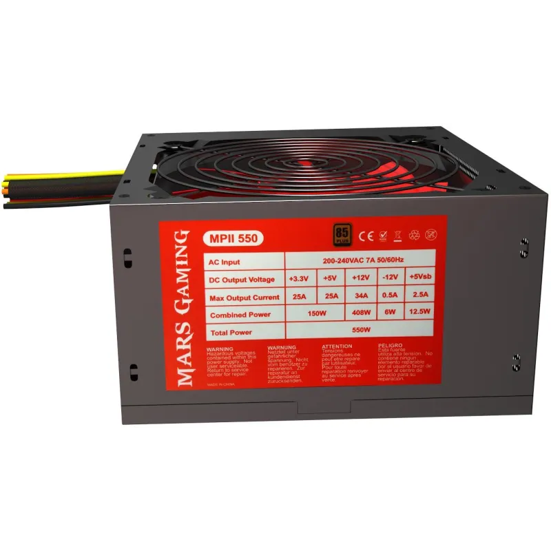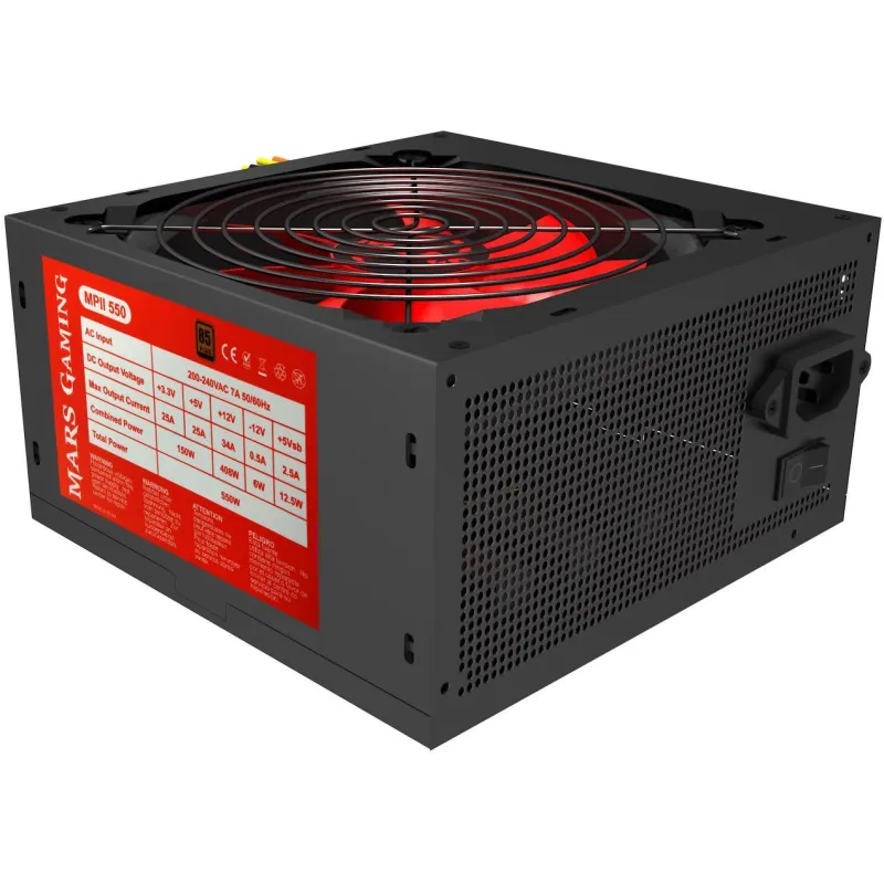 DISEÑO: La fuente de alimentación MPII550, se presenta alojada en una caja con recubrimiento negro mate y rejilla negra. Está fabricada conforme a las normas y directivas exigidas por la UE y cumple con la normativa ATX12V. Contiene un ventilador de alta calidad con sistema antivibraciones y sistema inteligente de control de velocidad Tacens, aspas rojas y marco negro.