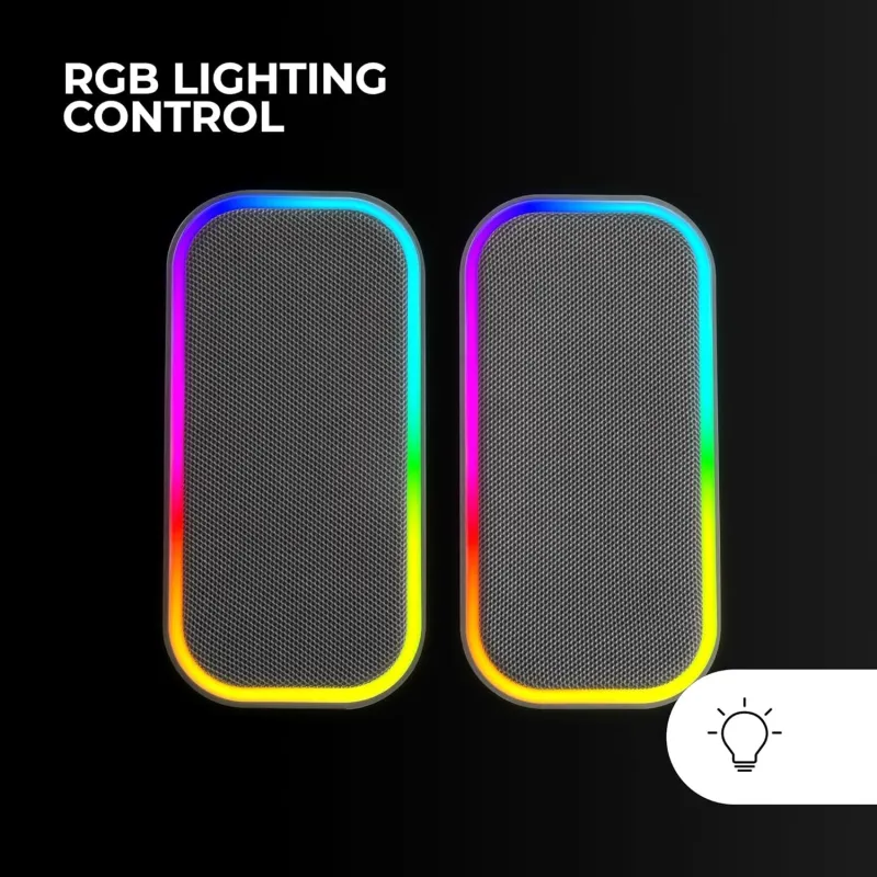 ILUMINACIÓN RGB CONTROL: Sumérgete en un espectáculo de luces con los modos de iluminación RGB dinámica de los altavoces MS-OM. Cada modo ha sido diseñado para complementar tu espacio de juego y crear un ambiente vibrante. Con una amplia gama de colores y efectos entre los que escoger, estos altavoces suenan y lucen espectaculares.