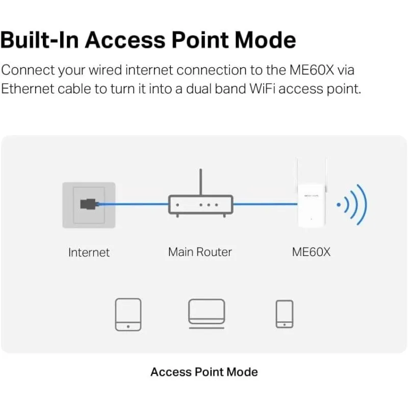 MODO DE PUNTO DE ACCESO INTEGRADO: ME60X es más que un simple extensor de alcance WiFi. Conecte su conexión a Internet por cable al ME60X mediante un cable Ethernet para convertirlo en un punto de acceso WiFi de doble banda.