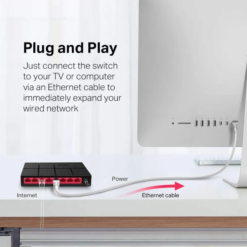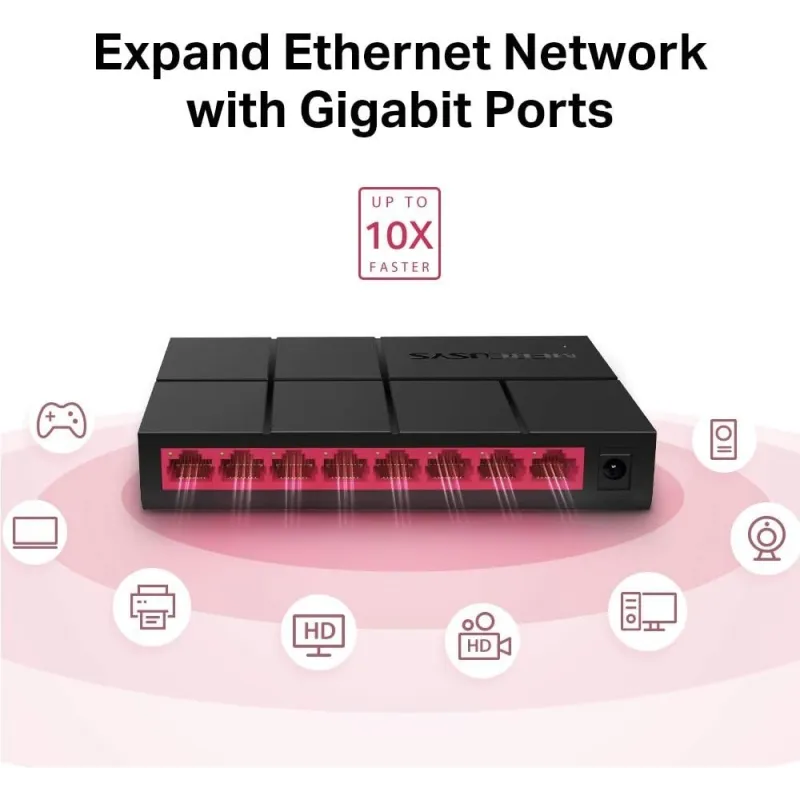 EXPANDE TU RED CON 8 PUERTOS GIGABIT: Amplía fácilmente la red con 8 puertos Ethernet Gigabit, 10 veces más rápidos que los puertos Ethernet 10/100 Mbps. El Switch MS105G es compatible con televisores Smart TV 4K, ordenadores, impresoras, cámaras IP, consolas y otros equipos, por lo que es perfecto para hogares y oficinas pequeñas.