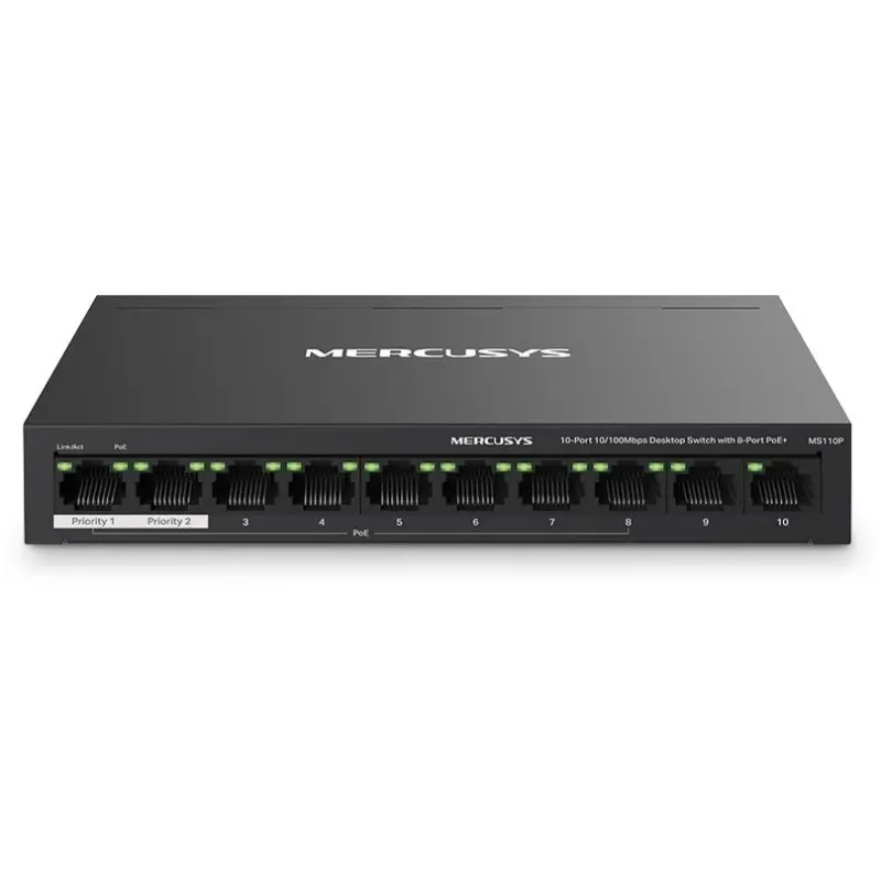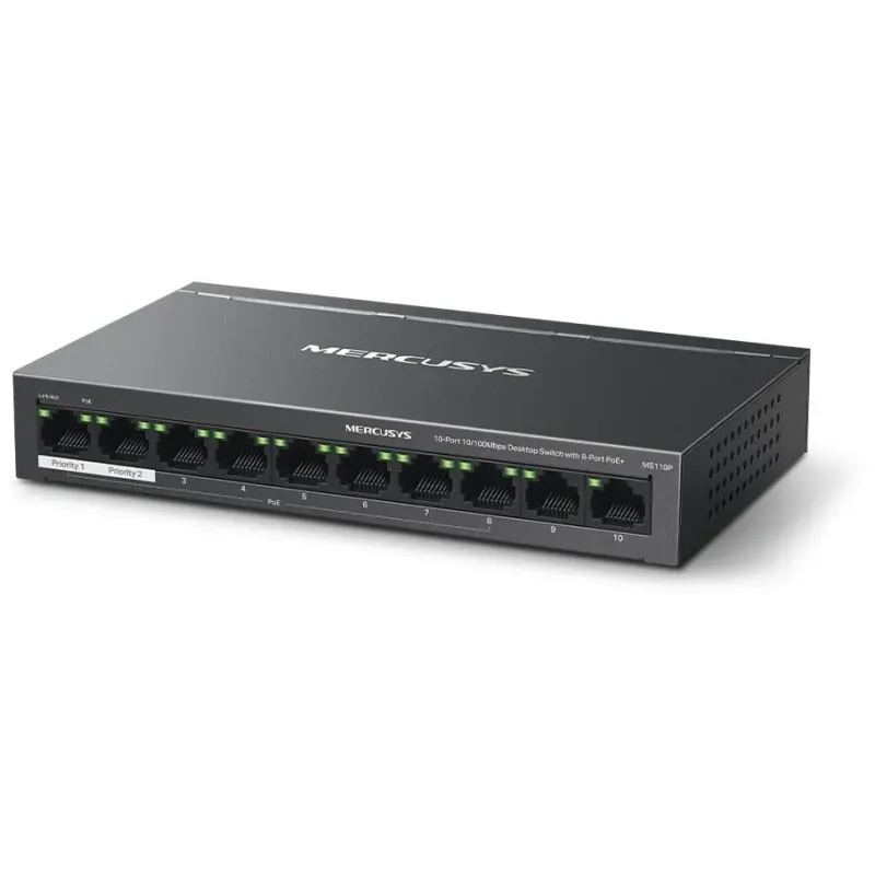 Switch Mercusys MS110P con alimentación mediante Ethernet PoE+ 10 puertos Fast Ethernet y tabla de direcciones MAC de 2000 entradas