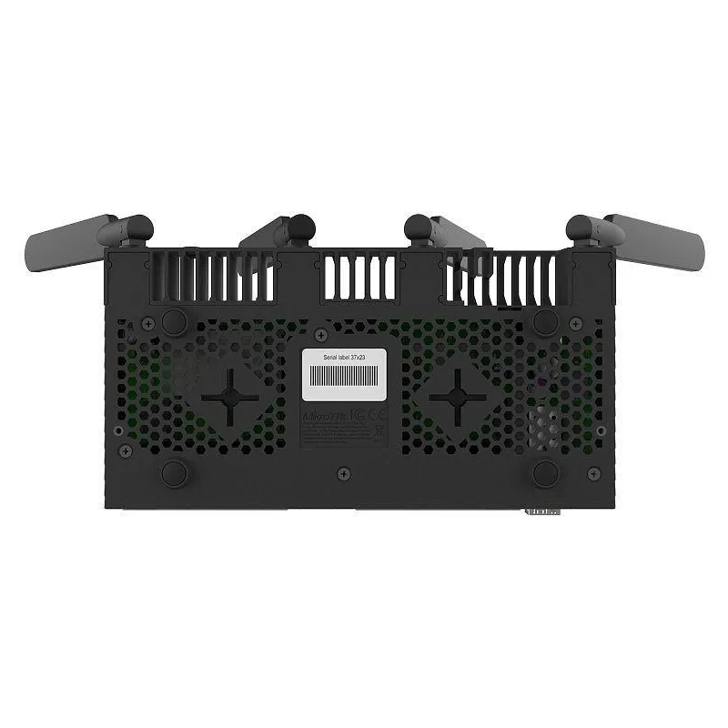 El RB4011iGS+5HacQ2HnD-IN (modelo WiFi) es una unidad de doble banda y cuatro cadenas con una tasa de datos soportada de hasta 1733 Mbps en 5GHz. Para dispositivos antiguos, la unidad también tiene una tarjeta inalámbrica de doble cadena de 2GHz instalada en la ranura miniPCI-e.
