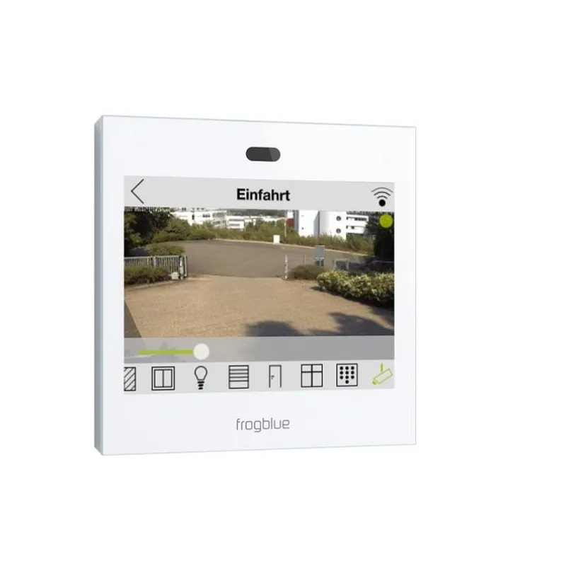 El frogDisplay se monta sobre una caja empotrada y se alimenta desde allí (230 V~). Gracias al gateway WLAN integrado en la pantalla, la conexión a la estación de puerta MOBOTIX y a otras cámaras del hogar es simple e inalámbrica al router WLAN existente. Además, el frogDisplay ofrece una integración completa en la Tecnología de Edificios Inteligentes de frogblue con numerosas otras funciones.