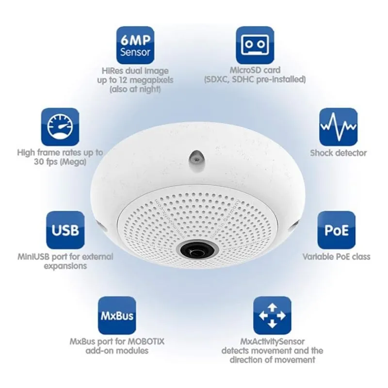 Cámara de Videovigilancia Mobotix MX-Q26B-6D016 con ángulo de visión 180°, resolución 3072 x 2048 píxeles y conectividad IP para interior o exterior