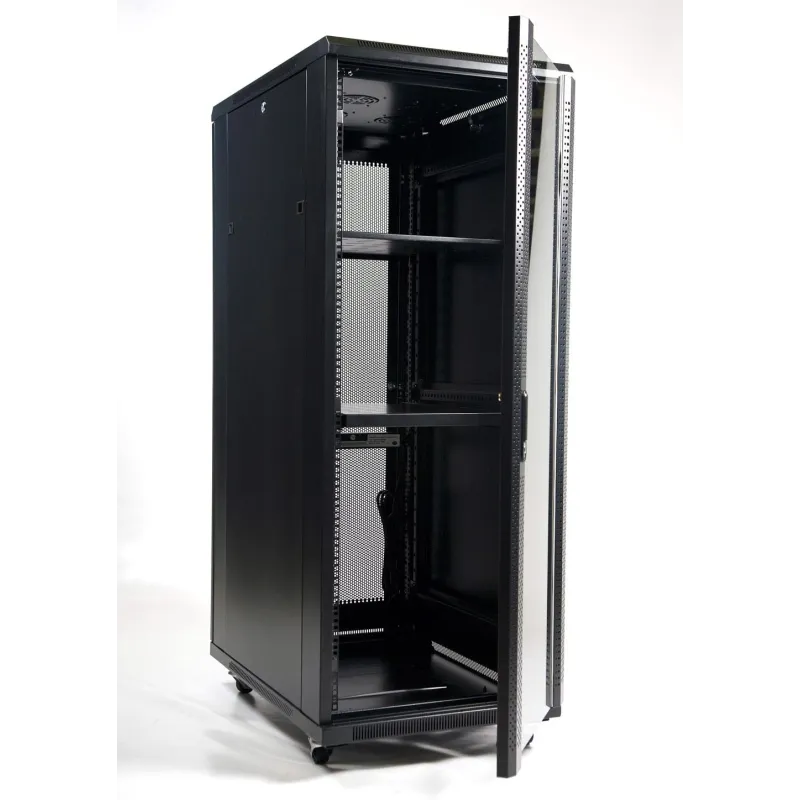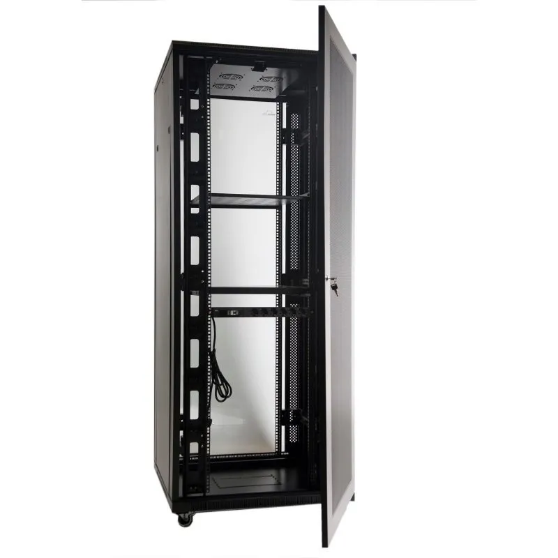UN ARMARIO RESISTENTE Y SEGURO: Está fabricado con materiales de alta calidad que le confieren una gran robustez y durabilidad. Su estructura está hecha de acero laminado en frío SPCC con un grosor de 2 mm, capaz de soportar una carga máxima de 800 kg sobre pies y 400 kg sobre ruedas. Su puerta delantera y trasera tiene un sistema de bloqueo con llave que impide el acceso no autorizado a los equipos. Además, cumple con el grado de protección IP20, que lo protege contra la entrada de polvo.