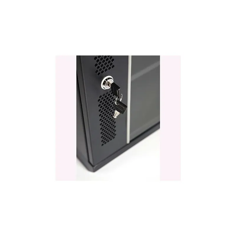 SEGURIDAD PARA TUS DISPOSITIVOS: Cuenta con una puerta delantera con cristal templado de seguridad de 4 mm, que te permite ver el interior del armario sin abrirlo. Además, la puerta tiene apertura de seguridad con llave, para evitar accesos no autorizados. El armario también tiene paneles laterales desmontables con fácil apertura y cierre lateral, y entradas de cableado por el panel trasero y la base inferior. Todo ello con un grado de protección IP20, que garantiza la resistencia del armario frente al polvo y los objetos sólidos.
