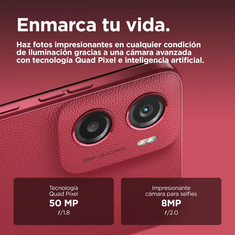 INMORTALIZA TUS MEJORES MOMENTOS: Disfruta de visualizaciones y sonidos impresionantes con el nuevo moto g05. Ve tus programas y películas favoritos en una pantalla superbrillante de 6,67", incluso a plena luz del día. Déjate envolver por el sonido de unos altavoces estéreo potentes con refuerzo de graves. Haz fotos maravillosamente definidas, de día o de noche, con el sistema de cámaras Quad Pixel de 50 MP(2), que integra un modo Retrato con inteligencia artificial. Ve más rápido con un rendimiento ultraeficiente y hasta 12 GB de RAM disponibles con la función Expansión de memoria(5). Gracias a su diseño con un acabado en cuero vegano, resistente a salpicaduras y derrames de agua(4), y con cristal Corning® Gorilla® Glass 3, moto g05, marcarás estilo durante años. Confía en una batería de 5200 mAh de larga duración y la carga TurboPower™, y guarda todo tu contenido y tus creaciones sin problema gracias a su amplio espacio de almacenamiento. El moto g05 impresiona a todos los niveles.