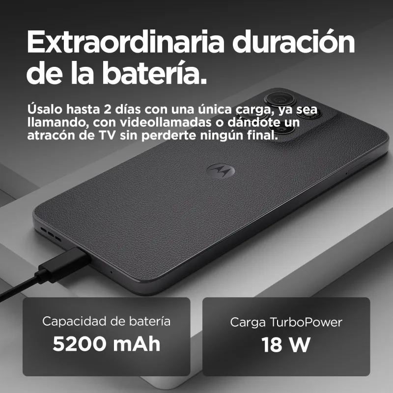 AUTONOMÍA QUE TE ACOMPAÑA TODO EL DÍA: Gracias a su batería de 5200 mAh, el Smartphone Motorola Moto G15 8/256GB Negro proporciona una duración prolongada sin necesidad de cargarlo constantemente. Ya sea para trabajar, jugar o ver contenido multimedia, puedes confiar en su autonomía. Además, con la tecnología Turbo Charge de 18 W, recuperarás energía en poco tiempo, lo que resulta ideal para usuarios activos. Esta combinación de batería de larga duración y carga rápida convierte al dispositivo en un aliado perfecto para quienes requieren movilidad sin interrupciones. No tendrás que preocuparte por quedarte sin energía en los momentos más importantes.
