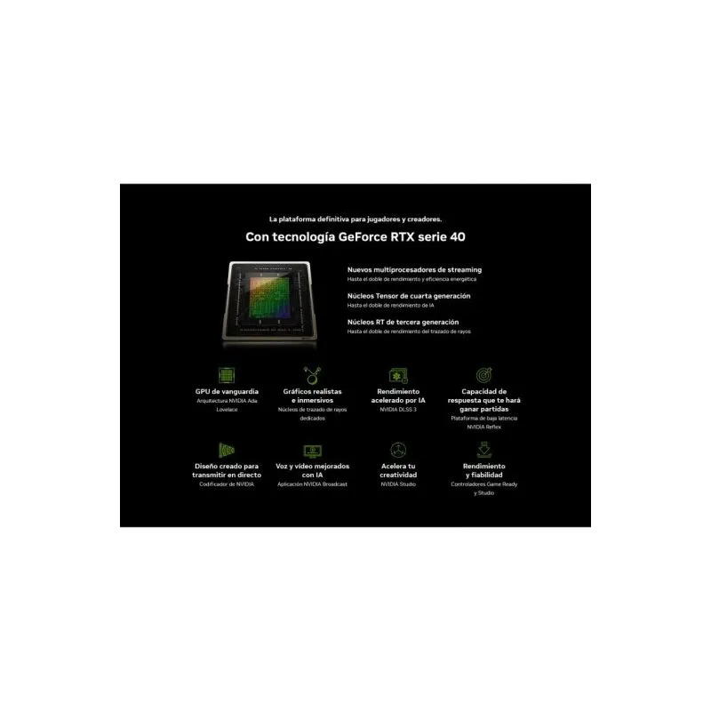 TUS IDEAS, ACELERADAS POR NVIDIA STUDIO: Creatividad con todo incluido. NVIDIA Studio es tu ventaja creativa con GPUs RTX de última generación que potencian las mejores aplicaciones creativas. El trazado de rayos proporciona gráficos hiperrealistas y el paquete Studio de herramientas asistidas por IA lleva las ideas del concepto a la finalización, más rápido. Los drivers de Studio proporcionan la máxima fiabilidad para que puedas centrarte en tu próxima gran idea. Eficacia optimizada de las tareas con una reducción significativa del tiempo de procesamiento en aplicaciones exigentes en rendimiento.