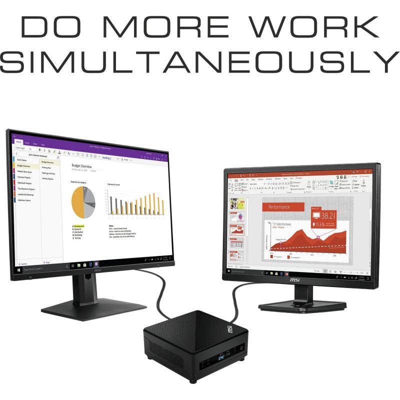 TRABAJA SIMULTÁNEAMENTE: ¿Estás viendo muchas páginas web y aplicaciones en un monitor pequeño? Con los puertos HDMI™ y DP, MSI Cubi 5 puede admitir monitores duales, puede hacer y ver más.