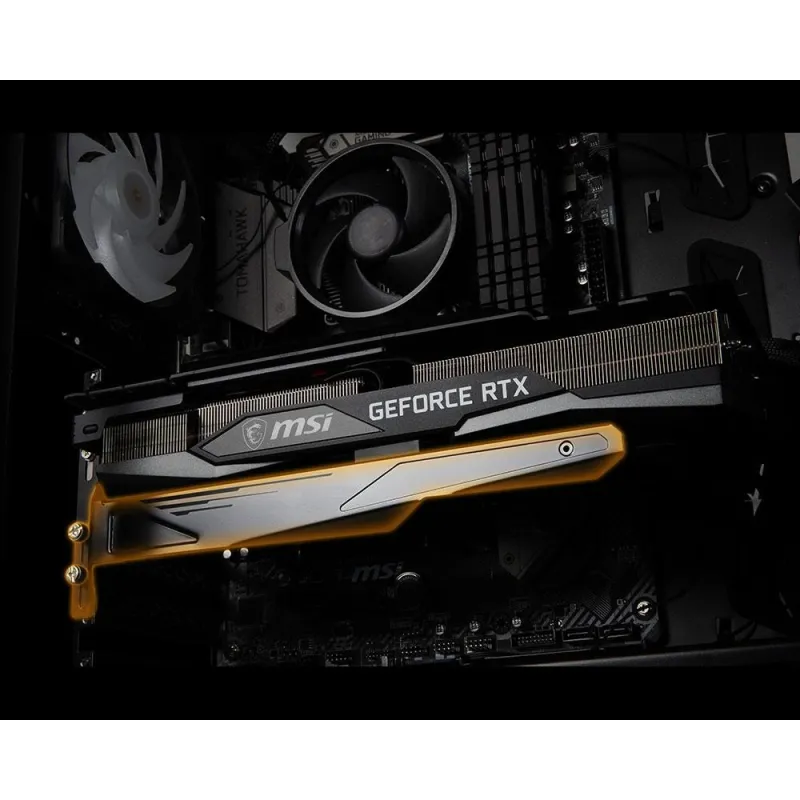 El diseño incluye un sistema de enfriamiento activo con la tecnología MSI TORX Fan 4.0 y tres ventiladores, asegurando una óptima disipación del calor. La estética no se queda atrás, con una iluminación multicolor que complementa su elegante color gris. Requiere un suministro de energía mínimo de 650 W y cuenta con dos conectores de energía suplementarios de 8-pin.