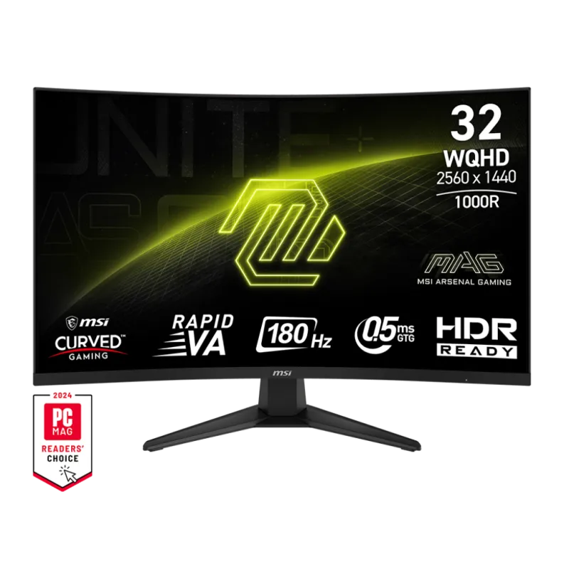 Monitor MSI MAG 325CQF con curvatura 1000R, tasa de refresco 180Hz, panel Rapid VA de 31.5", resolución WQHD y tiempo de respuesta de 0.5 ms.
